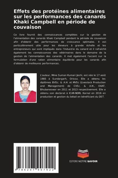 Ce livre fournit des connaissances complètes sur la gestion de l'alimentation des canards Khaki Campbell pendant la période de couvaison afin d'obtenir des performances de croissance optimales. Il est particulièrement utile pour les éleveurs à grande échelle et les entrepreneurs qui sont impliqués dans l'industrie du canard et il rafraîchit également les connaissances des vétérinaires dans le domaine de la gestion de l'alimentation des canards. Il met également l'accent sur la formulation d'une ration alimentaire équilibrée pour les canards afin d'obtenir de meilleures performances.