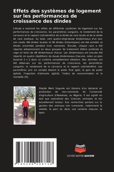 L'étude a examiné les effets de différents systèmes de logement sur les performances de croissance, les paramètres sanguins, le rendement de la carcasse et le rapport coût-bénéfice de la dinde de race locale et de la dinde de race exotique. Au total, cent quatre-vingt-douze dindonneaux d'un jour non sexés (96 dindes locales et 96 dindes britanniques) ont été achetés et élevés ensemble pendant trois semaines. Ensuite, chaque race a été répartie aléatoirement en deux groupes de traitement (litière profonde et cage en bois) de 48 dindonneaux chacun. Les dindonneaux ont ensuite été répartis en quatre répétitions de douze dindonneaux chacune, selon un plan factoriel 2 x 2 dans un schéma complètement aléatoire. Des données ont été obtenues sur les performances de croissance, les paramètres sanguins, le rendement de la carcasse et le rapport coût-bénéfice. Les paramètres pris en compte étaient le poids final (g/b), le gain de poids (g/b/d), l'ingestion d'aliments (g/b/d), l'indice de consommation et la mortalité (%).