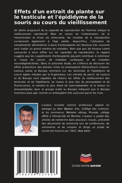 Un déclin progressif de la capacité de reproduction de l'homme indique le vieillissement reproductif. Mais en raison de l'urbanisation, de la mécanisation et d'une vie stressante, les troubles de la reproduction surviennent également à l'âge adulte. Aujourd'hui, l'utilisation de compléments alimentaires à base d'antioxydants est devenue très courante pour traiter un grand nombre de maladies. Bien que peu de travaux soient consacrés à leurs effets sur les capacités de reproduction, le rapport suggère que les suppléments d'antioxydants peuvent contribuer à minimiser le risque de cancer, de maladies cardiaques et de maladies neurodégénératives. Dans la présente étude, on s'efforce de découvrir les effets protecteurs des plantes riches en antioxydants Petroselinum crispum, Lactuca sativa et Bacopa monniera sur les testicules et l'épididyme de souris âgées induites par le D-galactose. Les extraits de persil, de Lactuca et de Bacopa sont capables de réduire les effets du vieillissement des testicules et de l'épididyme. Le niveau le plus bas de peroxydation et de fluorescence, le nombre le plus élevé de spermatozoïdes et la teneur en phospholipides dans le groupe traité au Bacopa indiquent que le Bacopa monniera peut agir comme un antioxydant très puissant parmi les trois.