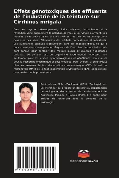Dans les pays en développement, l'industrialisation, l'urbanisation et la révolution verte augmentent la pollution de l'eau à un rythme alarmant. Les masses d'eau douce telles que les rivières, les lacs et les étangs sont devenues des sites d'élimination des déchets domestiques et industriels. Les substances toxiques s'accumulent dans les masses d'eau, ce qui a pour conséquence une pollution flagrante de l'eau. Les déchets industriels sont connus pour contenir des métaux lourds et d'autres substances toxiques. Le poisson est un organisme expérimental important, non seulement pour les études cytotoxicologiques et génétiques, mais aussi pour la recherche biochimique et physiologique. Pour évaluer la génotoxicité chez les animaux, le test d'aberration chromosomique (CAT), le test du micronoyau (MNT) et le test d'aberration érythrocytaire (EAT) sont utilisés comme des outils prometteurs.