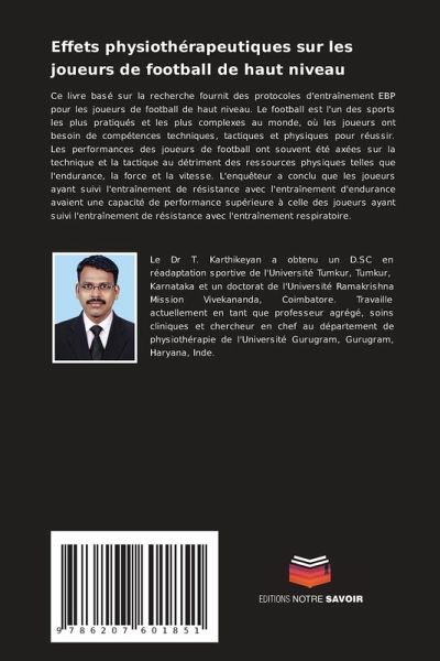 Ce livre basé sur la recherche fournit des protocoles d'entraînement EBP pour les joueurs de football de haut niveau. Le football est l'un des sports les plus pratiqués et les plus complexes au monde, où les joueurs ont besoin de compétences techniques, tactiques et physiques pour réussir. Les performances des joueurs de football ont souvent été axées sur la technique et la tactique au détriment des ressources physiques telles que l'endurance, la force et la vitesse. L'enquêteur a conclu que les joueurs ayant suivi l'entraînement de résistance avec l'entraînement d'endurance avaient une capacité de performance supérieure à celle des joueurs ayant suivi l'entraînement de résistance avec l'entraînement respiratoire.