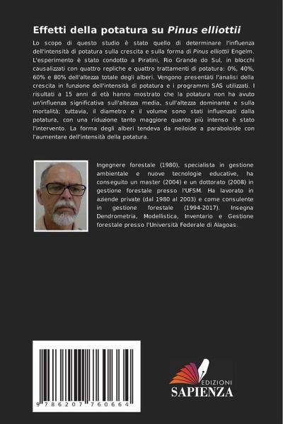 Lo scopo di questo studio è stato quello di determinare l'influenza dell'intensità di potatura sulla crescita e sulla forma di Pinus elliottii Engelm. L'esperimento è stato condotto a Piratini, Rio Grande do Sul, in blocchi causalizzati con quattro repliche e quattro trattamenti di potatura: 0%, 40%, 60% e 80% dell'altezza totale degli alberi. Vengono presentati l'analisi della crescita in funzione dell'intensità di potatura e i programmi SAS utilizzati. I risultati a 15 anni di età hanno mostrato che la potatura non ha avuto un'influenza significativa sull'altezza media, sull'altezza dominante e sulla mortalità; tuttavia, il diametro e il volume sono stati influenzati dalla potatura, con una riduzione tanto maggiore quanto più intenso è stato l'intervento. La forma degli alberi tendeva da neiloide a paraboloide con l'aumentare dell'intensità della potatura.