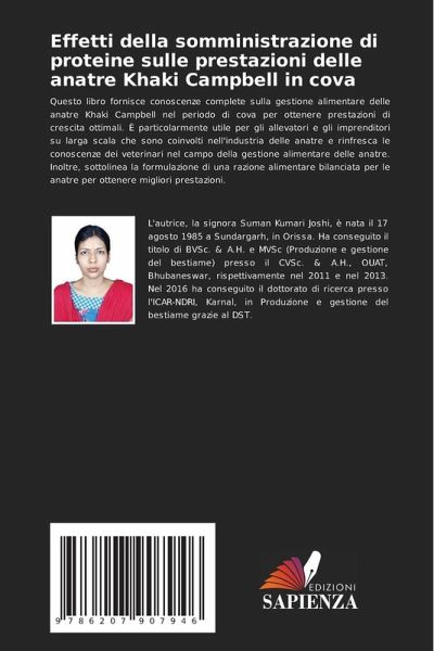 Questo libro fornisce conoscenze complete sulla gestione alimentare delle anatre Khaki Campbell nel periodo di cova per ottenere prestazioni di crescita ottimali. È particolarmente utile per gli allevatori e gli imprenditori su larga scala che sono coinvolti nell'industria delle anatre e rinfresca le conoscenze dei veterinari nel campo della gestione alimentare delle anatre. Inoltre, sottolinea la formulazione di una razione alimentare bilanciata per le anatre per ottenere migliori prestazioni.