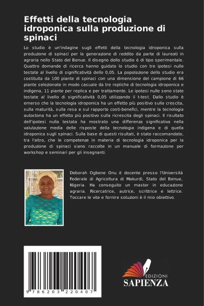 Lo studio è un'indagine sugli effetti della tecnologia idroponica sulla produzione di spinaci per la generazione di reddito da parte di laureati in agraria nello Stato del Benue. Il disegno dello studio è di tipo sperimentale. Quattro domande di ricerca hanno guidato lo studio con tre ipotesi nulle testate al livello di significatività dello 0,05. La popolazione dello studio era costituita da 100 piante di spinaci con una dimensione del campione di 66 piante selezionate in modo casuale da tre repliche di tecnologia idroponica e indigena, 11 piante per replica e per trattamento. Le ipotesi nulle sono state testate al livello di significatività 0,05 utilizzando il t-test. Dallo studio è emerso che la tecnologia idroponica ha un effetto più positivo sulla crescita, sulla maturità, sulla resa e sul rapporto costi-benefici, mentre la tecnologia autoctona ha un effetto più positivo sulla ricrescita degli spinaci. Il risultato dell'ipotesi nulla testata ha mostrato una differenza significativa nella valutazione media delle risposte della tecnologia indigena e di quella idroponica sugli spinaci. Sulla base di questi risultati, è stato raccomandato, tra l'altro, che le competenze in materia di tecnologia idroponica per la produzione di spinaci siano raccolte in un manuale di formazione per workshop e seminari per gli insegnanti.