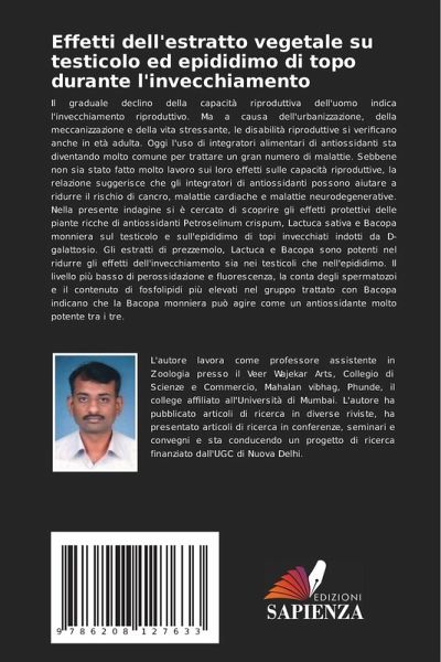 Il graduale declino della capacità riproduttiva dell'uomo indica l'invecchiamento riproduttivo. Ma a causa dell'urbanizzazione, della meccanizzazione e della vita stressante, le disabilità riproduttive si verificano anche in età adulta. Oggi l'uso di integratori alimentari di antiossidanti sta diventando molto comune per trattare un gran numero di malattie. Sebbene non sia stato fatto molto lavoro sui loro effetti sulle capacità riproduttive, la relazione suggerisce che gli integratori di antiossidanti possono aiutare a ridurre il rischio di cancro, malattie cardiache e malattie neurodegenerative. Nella presente indagine si è cercato di scoprire gli effetti protettivi delle piante ricche di antiossidanti Petroselinum crispum, Lactuca sativa e Bacopa monniera sul testicolo e sull'epididimo di topi invecchiati indotti da D-galattosio. Gli estratti di prezzemolo, Lactuca e Bacopa sono potenti nel ridurre gli effetti dell'invecchiamento sia nei testicoli che nell'epididimo. Il livello più basso di perossidazione e fluorescenza, la conta degli spermatozoi e il contenuto di fosfolipidi più elevati nel gruppo trattato con Bacopa indicano che la Bacopa monniera può agire come un antiossidante molto potente tra i tre.
