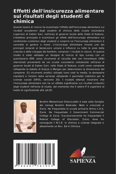 Questo lavoro di ricerca ha esaminato l'effetto dell'insicurezza alimentare sui risultati accademici degli studenti di chimica della scuola secondaria superiore di Sabon Gari, nell'area di governo locale dello Stato di Kaduna. L'obiettivo principale è esaminare gli effetti dell'insicurezza alimentare sul rendimento scolastico degli studenti e scoprire se l'insicurezza alimentare è sensibile al genere o meno. L'insicurezza alimentare rimane uno dei principali ostacoli al benessere umano e influisce su tutte le aree della crescita e dello sviluppo dei bambini, compresi i risultati in classe. In questo studio è stato utilizzato un disegno di ricerca di tipo survey con un questionario EFIS come strumento di raccolta dati con trecentosei (306) intervistati provenienti da sei scuole secondarie selezionate nell'area di governo locale di Sabon Gari, nello Stato di Kaduna, scelti come campione utilizzando la tabella di Krejcie e Morgan per determinare la dimensione del campione. Gli strumenti analitici utilizzati sono stati la media, la deviazione standard e l'analisi della varianza utilizzando il pacchetto statistico per le scienze sociali (SPSS, versione 20). I risultati ottenuti mostrano che l'insicurezza alimentare non ha un effetto significativo sui risultati scolastici degli studenti nell'area di studio, dal momento che il valore P è superiore al livello di significatività alfa ¿0,05.