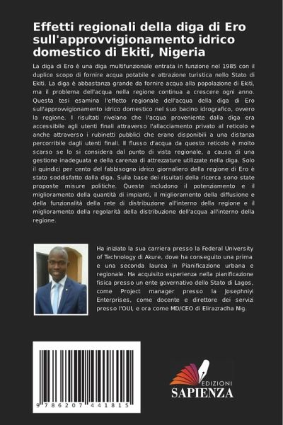 La diga di Ero è una diga multifunzionale entrata in funzione nel 1985 con il duplice scopo di fornire acqua potabile e attrazione turistica nello Stato di Ekiti. La diga è abbastanza grande da fornire acqua alla popolazione di Ekiti, ma il problema dell'acqua nella regione continua a crescere ogni anno. Questa tesi esamina l'effetto regionale dell'acqua della diga di Ero sull'approvvigionamento idrico domestico nel suo bacino idrografico, ovvero la regione. I risultati rivelano che l'acqua proveniente dalla diga era accessibile agli utenti finali attraverso l'allacciamento privato al reticolo e anche attraverso i rubinetti pubblici che erano disponibili a una distanza percorribile dagli utenti finali. Il flusso d'acqua da questo reticolo è molto scarso se lo si considera dal punto di vista regionale, a causa di una gestione inadeguata e della carenza di attrezzature utilizzate nella diga. Solo il quindici per cento del fabbisogno idrico giornaliero della regione di Ero è stato soddisfatto dalla diga. Sulla base dei risultati della ricerca sono state proposte misure politiche. Queste includono il potenziamento e il miglioramento della quantità di impianti, il miglioramento della diffusione e della funzionalità della rete di distribuzione all'interno della regione e il miglioramento della regolarità della distribuzione dell'acqua all'interno della regione.