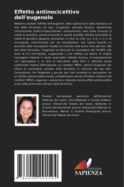 Abbiamo studiato l'effetto dell'eugenolo, della capsaicina e della lidocaina sul test della formalina nei topi. L'eugenolo, derivato fenolico, denominato chimicamente 4-allil-2-metossifenolo, comunemente noto come essenza di chiodi di garofano, poiché presente in grandi quantità nell'olio essenziale di chiodi di garofano (Eugenia aromatica), in dosi di 0,01; 0,1; 0,3; 1; 3 e 10 microg/sito, somministrati per via intraplantare, non hanno favorito un aumento della nocicezione rispetto al controllo nella prima fase del test. Nel test della formalina, l¿eugenolo ha diminuito la nocicezione del 70,69%, alla dose di 0,1 microg/sito, suggerendo il suo effetto sul dolore di origine neurogena inibendo in modo reversibile l¿attività nervosa. Il pretrattamento con capsazepina e un test di distruzione delle fibre C afferenti hanno confermato l'azione dell'eugenolo sui recettori TRPV1, poiché l'eugenolo non riduce la nocicezione causata dalla formalina in nessuno dei due test. Concludiamo che l'eugenolo a piccole dosi non aumenta la nocicezione; ha un effetto antinocicettivo locale, probabilmente dovuto all'azione inibitoria dei recettori TRPV1; eugenolo, capsaicina e lidocaina hanno effetti antinocicettivi locali nella prima fase del test della formalina.