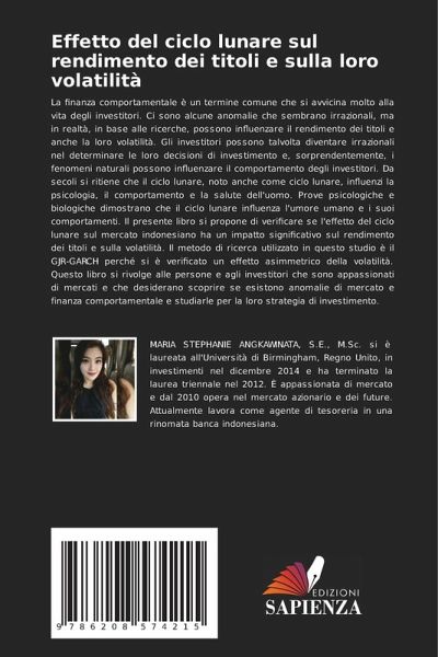 La finanza comportamentale è un termine comune che si avvicina molto alla vita degli investitori. Ci sono alcune anomalie che sembrano irrazionali, ma in realtà, in base alle ricerche, possono influenzare il rendimento dei titoli e anche la loro volatilità. Gli investitori possono talvolta diventare irrazionali nel determinare le loro decisioni di investimento e, sorprendentemente, i fenomeni naturali possono influenzare il comportamento degli investitori. Da secoli si ritiene che il ciclo lunare, noto anche come ciclo lunare, influenzi la psicologia, il comportamento e la salute dell'uomo. Prove psicologiche e biologiche dimostrano che il ciclo lunare influenza l'umore umano e i suoi comportamenti. Il presente libro si propone di verificare se l'effetto del ciclo lunare sul mercato indonesiano ha un impatto significativo sul rendimento dei titoli e sulla volatilità. Il metodo di ricerca utilizzato in questo studio è il GJR-GARCH perché si è verificato un effetto asimmetrico della volatilità. Questo libro si rivolge alle persone e agli investitori che sono appassionati di mercati e che desiderano scoprire se esistono anomalie di mercato e finanza comportamentale e studiarle per la loro strategia di investimento.