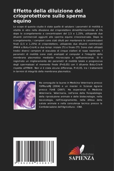 Lo scopo di questo studio è stato quello di valutare i parametri di motilità e vitalità in vitro nella diluizione del crioprotettore dimetilformammide al 5% dopo lo scongelamento a concentrazioni del 2,5 e 1,25%, utilizzando due diluenti commerciali aggiunti allo sperma equino crioconservato. Dopo lo scongelamento, i campioni sono stati diluiti per mantenere le concentrazioni finali (2,5 e 1,25%) di crioprotettore, utilizzando due diluenti commerciali (FR4® e Botu-Crio®) a due tempi: iniziale (Ti) e finale (Tf). Sono stati utilizzati tredici diversi campioni di eiaculato di cinque stalloni di razza nazionale. I parametri di motilità sono stati analizzati al computer e l'integrità della membrana plasmatica mediante microscopia a epifluorescenza. Si è registrato un miglioramento dei parametri di motilità totale e progressiva degli spermatozoi al momento finale (P<0,05) con il diluente Botu-Crio® rispetto all'FR4®. Non vi è stata alcuna differenza, P>0,05, tra i trattamenti in termini di integrità della membrana plasmatica.