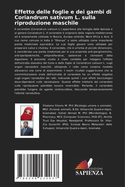 Il coriandolo (Coriandrum sativum L.) appartiene alla famiglia delle Apiceae e al genere Coriandrum L. Il coriandolo è originario della regione mediterranea ed è ampiamente coltivato in Russia, Europa centrale, Nord Africa e Asia. Il suo nome comune in India è ¿Dhanyä e viene utilizzato come importante pianta medicinale ayurvedica. Le sue foglie giovani sono utilizzate per preparare salse e chutney. Il coriandolo, che è un'erba di piccole dimensioni, è considerato una pianta medicinale per le sue proprietà anti-iperglicemiche, anti-iperlipidemiche, antiproliferative, ipotensive e stimolanti della digestione. Il presente studio è stato condotto per indagare l'effetto dell'estratto etanolico del fusto e delle foglie di Coriandrum sativum L. sugli organi riproduttivi maschili, utilizzando il ratto come sistema modello attraverso una serie di esperimenti. I nostri risultati suggeriscono che la somministrazione orale dell'estratto di coriandolo ha un effetto negativo sugli organi riproduttivi dei ratti, indicando quindi i suoi effetti tossicologici dose-dipendenti sulla riproduzione. Questo effetto inibitorio del coriandolo sulla riproduzione potrebbe essere reversibile. Pertanto, il coriandolo potrebbe fungere da agente contraccettivo, bloccando temporaneamente l'attività riproduttiva.
