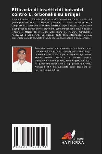Il libro intitolato "Efficacia degli insetticidi botanici contro la piralide dei germogli e dei frutti, L. orbonalis (Guenee.) su brinjal" è un lavoro di compilazione e racchiude un discreto utilizzo a scopo di ricerca. Questo libro è composto da capitoli su vari argomenti, come Introduzione, Revisione della letteratura, Metodi dei materiali, Discussione dei risultati, Conclusione riassuntiva e Bibliografia. La maggior parte delle informazioni è stata presentata in modo completo e lucido per una facile lettura e comprensione.