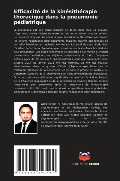 La pneumonie est une cause majeure de décès dans tous les groupes d'âge, avec quatre millions de morts par an, en particulier chez les enfants de moins de cinq ans. La kinésithérapie thoracique a été utilisée pour traiter les enfants hospitalisés pour pneumonie, mais les preuves scientifiques de son effet bénéfique en pédiatrie font défaut. L'objectif de cette étude était d'évaluer l'effet de la physiothérapie thoracique sur les enfants hospitalisés pour pneumonie. Une étude randomisée et contrôlée a été menée à l'hôpital universitaire pédiatrique des hôpitaux universitaires du Caire. Cinquante enfants âgés de 29 jours à 5 ans hospitalisés pour une pneumonie entre octobre 2014 et janvier 2015 ont été obtenus, 25 ont été répartis aléatoirement dans le groupe d'étude (physiothérapie thoracique et traitement standard de la pneumonie) et 25 dans le groupe de contrôle (le traitement standard de la pneumonie seul sans physiothérapie thoracique). On a constaté une amélioration significative du délai de résolution clinique, de la fréquence respiratoire et de la saturation en oxygène chez les enfants hospitalisés pour pneumonie après le programme de kinésithérapie respiratoire. Il a été conclu que la kinésithérapie thoracique apportait des améliorations significatives chez les enfants hospitalisés pour pneumonie.