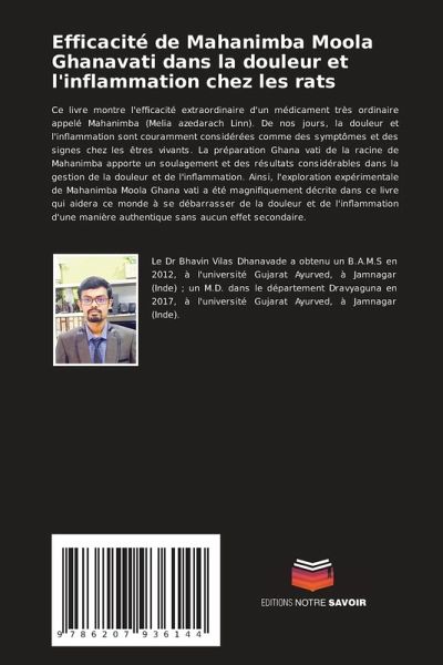 Ce livre montre l'efficacité extraordinaire d'un médicament très ordinaire appelé Mahanimba (Melia azedarach Linn). De nos jours, la douleur et l'inflammation sont couramment considérées comme des symptômes et des signes chez les êtres vivants. La préparation Ghana vati de la racine de Mahanimba apporte un soulagement et des résultats considérables dans la gestion de la douleur et de l'inflammation. Ainsi, l'exploration expérimentale de Mahanimba Moola Ghana vati a été magnifiquement décrite dans ce livre qui aidera ce monde à se débarrasser de la douleur et de l'inflammation d'une manière authentique sans aucun effet secondaire.