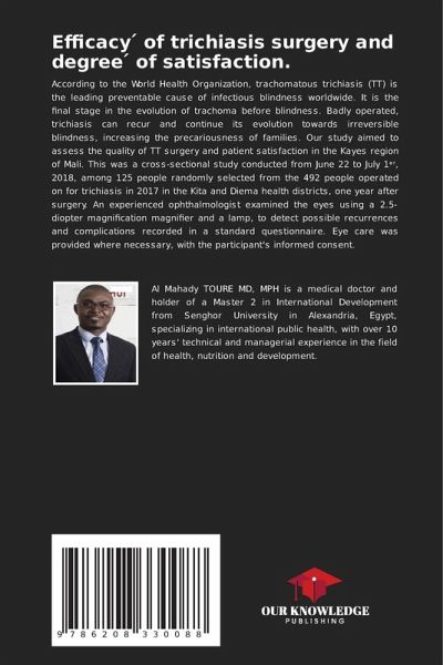 According to the World Health Organization, trachomatous trichiasis (TT) is the leading preventable cause of infectious blindness worldwide. It is the final stage in the evolution of trachoma before blindness. Badly operated, trichiasis can recur and continue its evolution towards irreversible blindness, increasing the precariousness of families. Our study aimed to assess the quality of TT surgery and patient satisfaction in the Kayes region of Mali. This was a cross-sectional study conducted from June 22 to July 1 , 2018, among 125 people randomly selected from the 492 people operated on for trichiasis in 2017 in the Kita and Diema health districts, one year after surgery. An experienced ophthalmologist examined the eyes using a 2.5-diopter magnification magnifier and a lamp, to detect possible recurrences and complications recorded in a standard questionnaire. Eye care was provided where necessary, with the participant's informed consent.