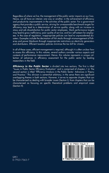 Efficiency in the Public Sector is divided into two sections. The first is titled "Issues in Public Sector Efficiency Evaluation" and comprises of chapters 1-4. The second section is titled "Efficiency Analysis in the Public Sector - Advances in Theory and Practice." This division is somewhat arbitrary, in the sense there are significant overlapping themes in both sections. However, it serves to separate chapters that can be characterised as dealing with broader issues (Section I), from chapters that can be characterised as focusing on specific theoretical problems and empirical cases (Section II).