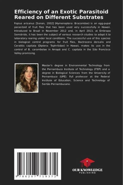 Fopius arisanus [Sonan, 1932] (Hymenoptera: Braconidae) is an egg-pupal parasitoid of fruit flies that has been used very successfully in Hawaii. Introduced to Brazil in November 2012 and, in April 2013, at Embrapa Semiárido, it has been the subject of various research studies to adapt it to laboratory rearing under local conditions. The successful use of this species in biological control programs for fruit flies, Bactrocera dorsalis and Ceratitis capitata (Diptera: Tephritidae) in Hawaii, makes its use in the control of B. carambolae in Amapá and C. capitata in the São Francisco Valley promising.