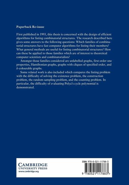 First published in 1993, this thesis is concerned with the design of efficient algorithms for listing combinatorial structures. The research described here gives some answers to the following questions: which families of combinatorial structures have fast computer algorithms for listing their members? What general methods are useful for listing combinatorial structures? How can these be applied to those families which are of interest to theoretical computer scientists and combinatorialists? Amongst those families considered are unlabelled graphs, first order one properties, Hamiltonian graphs, graphs with cliques of specified order, and k-colourable graphs. Some related work is also included, which compares the listing problem with the difficulty of solving the existence problem, the construction problem, the random sampling problem, and the counting problem. In particular, the difficulty of evaluating Pólya's cycle polynomial is demonstrated.