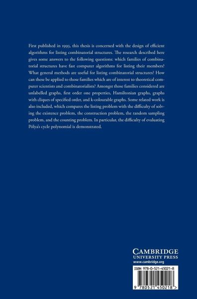First published in 1993, this thesis is concerned with the design of efficient algorithms for listing combinatorial structures. The research described here gives some answers to the following questions: which families of combinatorial structures have fast computer algorithms for listing their members? What general methods are useful for listing combinatorial structures? How can these be applied to those families which are of interest to theoretical computer scientists and combinatorialists? Amongst those families considered are unlabelled graphs, first order one properties, Hamiltonian graphs, graphs with cliques of specified order, and k-colourable graphs. Some related work is also included, which compares the listing problem with the difficulty of solving the existence problem, the construction problem, the random sampling problem, and the counting problem. In particular, the difficulty of evaluating Pólya's cycle polynomial is demonstrated.