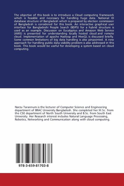 The objective of this book is to introduce a Cloud computing framework which is feasible and necessary for handling huge data. National ID database structure of Bangladesh which is prepared by election commission of Bangladesh is considered for this book. An interactive graphical user interface for Bangladeshi People Search (BDPS) for a hybrid structure is used as an example. Discussion on Eucalyptus and Amazon Web Service (AWS) is presented for understanding locally hosted cloud and remote cloud. Implementation of apache Hadoop and HiveQL is discussed briefly. Some common limitations of big data handling is also pinpointed. A new approach for handling public data visibility problem is also addressed in this book. This book would be useful for developing a system based on cloud computing.