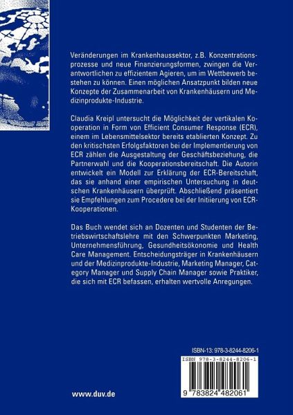 Claudia Kreipl untersucht die Möglichkeit der vertikalen Kooperation in Form von Efficient Consumer Response (ECR), einem im Lebensmittelsektor bereits etablierten Konzept. Zu den kritischsten Erfolgsfaktoren bei der Implementierung von ECR zählen die Ausgestaltung der Geschäftsbeziehung, die Partnerwahl und die Kooperationsbereitschaft. Die Autorin entwickelt ein Modell zur Erklärung der ECR-Bereitschaft, das sie anhand einer empirischen Untersuchung in deutschen Krankenhäusern überprüft. Abschließend präsentiert sie Empfehlungen zum Procedere bei der Initiierung von ECR-Kooperationen.