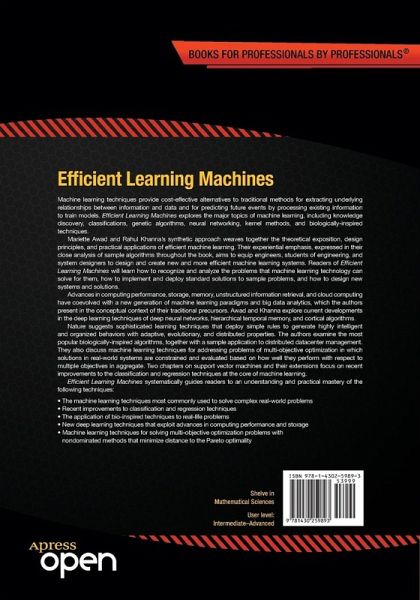 Mariette Awad and Rahul Khanna's synthetic approach weaves together the theoretical exposition, design principles, and practical applications of efficient machine learning. Their experiential emphasis, expressed in their close analysis of sample algorithms throughout the book, aims to equip engineers, students of engineering, and system designers to design and create new and more efficient machine learning systems. Readers of Efficient Learning Machines will learn how to recognize and analyze the problems that machine learning technology can solve for them, how to implement and deploy standard solutions to sample problems, and how to design new systems and solutions.