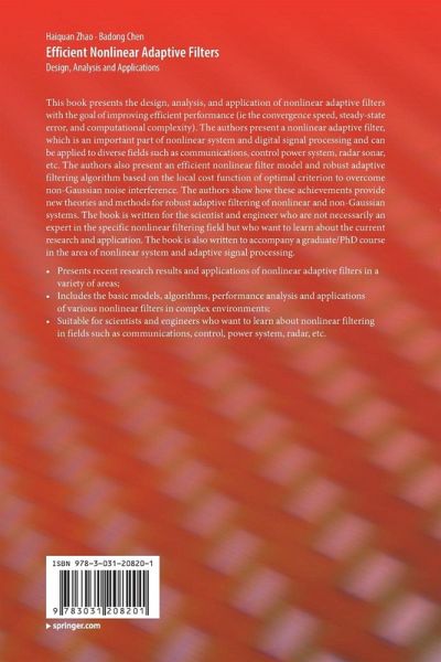 This book presents the design, analysis, and application of nonlinear adaptive filters with the goal of improving efficient performance (ie the convergence speed, steady-state error, and computational complexity). The authors present a nonlinear adaptive filter, which is an important part of nonlinear system and digital signal processing and can be applied to diverse fields such as communications, control power system, radar sonar, etc. The authors also present an efficient nonlinear filter model and robust adaptive filtering algorithm based on the local cost function of optimal criterion to overcome non-Gaussian noise interference. The authors show how these achievements provide new theories and methods for robust adaptive filtering of nonlinear and non-Gaussian systems. The book is written for the scientist and engineer who are not necessarily an expert in the specific nonlinear filtering field but who want to learn about the current research and application. The book is also writtento accompany a graduate/PhD course in the area of nonlinear system and adaptive signal processing.