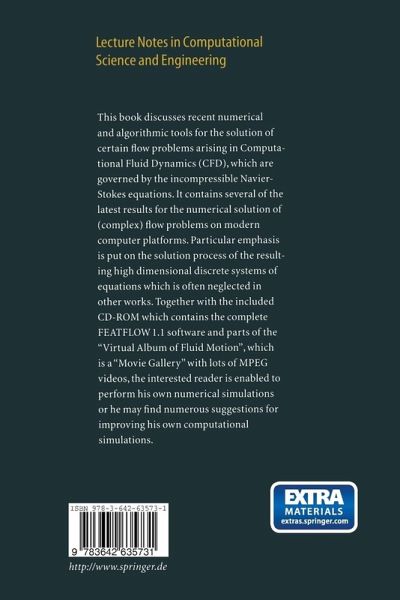 The scope ofthis book is to discuss recent numerical and algorithmic tools for the solution of certain flow problems arising in Computational Fluid Dynam ics (CFD). Here, we mainly restrict ourselves to the case ofthe incompressible Navier-Stokes equations, Ut - v~u + U . V'u+ V'p = f , V'·u = o. (1) These basic equations already play an important role in CFD, both for math ematicians as well as for more practical scientists: Physically important facts with "real life" character can be described by them, including also economical aspects in industrial applications. On the other hand, the equations in (1) provide the complete spectrum of numerical problems nowadays concerning the mathematical treatment of partial differential equations. Although this field of research may appear to be a small part only inside of CFD, it was and still is of great interest for mathematicians as well as engineers, physicists, computer scientists and many more: a fact which can be easily checked by counting the numerous publications. Nevertheless, our contribution has some unique characteristics since it contains a few ofthe lat est results for the numerical solution of (complex) flow problems on modern computer platforms. In this book, our particular emphasis lies on the solu tion process ofthe resulting high dimensional discrete systems ofequations which is often neglected in other works. Together with the included CDROM, which contains the 'FEATFLOW 1.