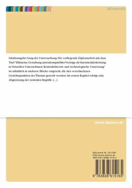 Die vorliegende Diplomarbeit mit dem Titel "Effiziente Gestaltung anreizkompatibler Verträge als Intermediärsleistung in Virtuellen Unternehmen: Kontrakttheorie und technologische Umsetzung" ist inhaltlich in mehrere Blöcke eingeteilt, die den verschiedenen Gesichtspunkten des Themas gerecht werden.