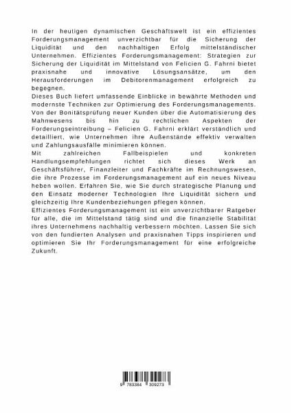 In der heutigen dynamischen Geschäftswelt ist ein effizientes Forderungsmanagement unverzichtbar für die Sicherung der Liquidität und den nachhaltigen Erfolg mittelständischer Unternehmen. Effizientes Forderungsmanagement: Strategien zur Sicherung der Liquidität im Mittelstand von Felicien G. Fahrni bietet praxisnahe und innovative Lösungsansätze, um den Herausforderungen im Debitorenmanagement erfolgreich zu begegnen.Dieses Buch liefert umfassende Einblicke in bewährte Methoden und modernste Techniken zur Optimierung des Forderungsmanagements. Von der Bonitätsprüfung neuer Kunden über die Automatisierung des Mahnwesens bis hin zu rechtlichen Aspekten der Forderungseintreibung - Felicien G. Fahrni erklärt verständlich und detailliert, wie Unternehmen ihre Außenstände effektiv verwalten und Zahlungsausfälle minimieren können.Mit zahlreichen Fallbeispielen und konkreten Handlungsempfehlungen richtet sich dieses Werk an Geschäftsführer, Finanzleiter und Fachkräfte im Rechnungswesen,die ihre Prozesse im Forderungsmanagement auf ein neues Niveau heben wollen. Erfahren Sie, wie Sie durch strategische Planung und den Einsatz moderner Technologien Ihre Liquidität sichern und gleichzeitig Ihre Kundenbeziehungen pflegen können.Effizientes Forderungsmanagement ist ein unverzichtbarer Ratgeber für alle, die im Mittelstand tätig sind und die finanzielle Stabilität ihres Unternehmens nachhaltig verbessern möchten. Lassen Sie sich von den fundierten Analysen und praxisnahen Tipps inspirieren und optimieren Sie Ihr Forderungsmanagement für eine erfolgreiche Zukunft.