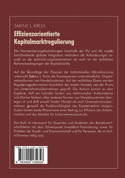Die Harmonisierungsbestrebungen innerhalb der EU und die rapide fortschreitende globale Intergration verändern die Anforderungen sowohl an die technisch-organisatorischen als auch an dierechtlichen Rahmenbedingungen der Kapitalmärkte. Auf der Grundlage der Theorien der Institutionellen Mikroökonomie untersucht Sabine L. Kress die Konsequenzen unterschiedlicher Organisationsformen von Handelssystemen. Auf der rechtlichen Ebene werden Regulierungsalternativen hinsichtlich des Insider-Handels und der Praxis von Unternehmensübernahmen geprüft. Es zeigt sich, daß ein hybrides System aus elektronischer Aktienbörse und Market Makern allen anderen Formen von Hand elssystemen überlegen ist und daß sowohl Insider-Handel als auch Unternehmensübernahmen generell die Funktionsfähigkeit des Kapitalmarktes steigern. Zudem leisten beide Phänomene einen Beitrag zur Effiziens des Arbeitsmarktes und des Marktes für Unternehmenskontrolle.