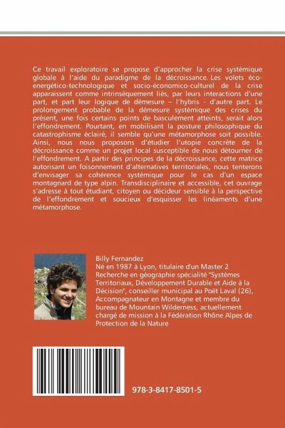 Ce travail exploratoire se propose d'approcher la crise systémique globale à l'aide du paradigme de la décroissance. Les volets éco-energético-technologique et socio-économico-culturel de la crise apparaissent comme intrinsèquement liés, par leurs interactions d'une part, et part leur logique de démesure - l'hybris - d'autre part. Le prolongement probable de la démesure systémique des crises du présent, une fois certains points de basculement atteints, serait alors l'effondrement. Pourtant, en mobilisant la posture philosophique du catastrophisme éclairé, il semble qu'une métamorphose soit possible. Ainsi, nous nous proposons d'étudier l'utopie concrète de la décroissance comme un projet local susceptible de nous détourner de l'effondrement. A partir des principes de la décroissance, cette matrice autorisant un foisonnement d'alternatives territoriales, nous tenterons d'envisager sa cohérence systémique pour le cas d'un espace montagnard de type alpin. Transdisciplinaire et accessible, cet ouvrage s'adresse à tout étudiant, citoyen ou décideur sensible à la perspective de l'effondrement et soucieux d'esquisser les linéaments d'une métamorphose.