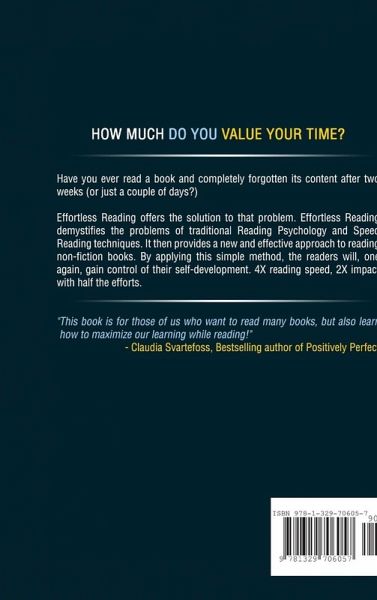 Effortless Reading demystifies the problems of traditional Reading Psychology and Speed Reading techniques. It then provides a new and effective approach to reading non-fiction books. By applying this simple method, the readers will, one again, gain control of their self-development. 4X reading speed, 2X impact with half the efforts.