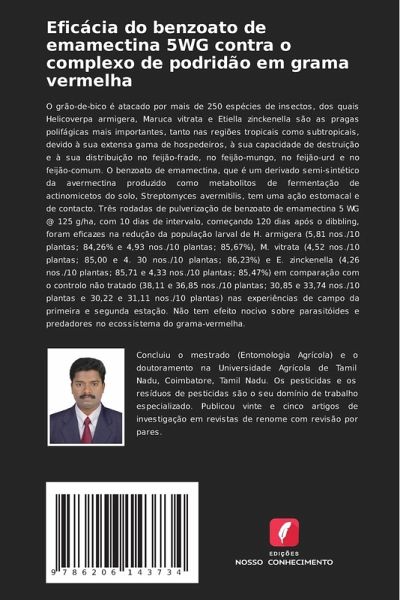 O grão-de-bico é atacado por mais de 250 espécies de insectos, dos quais Helicoverpa armigera, Maruca vitrata e Etiella zinckenella são as pragas polifágicas mais importantes, tanto nas regiões tropicais como subtropicais, devido à sua extensa gama de hospedeiros, à sua capacidade de destruição e à sua distribuição no feijão-frade, no feijão-mungo, no feijão-urd e no feijão-comum. O benzoato de emamectina, que é um derivado semi-sintético da avermectina produzido como metabolitos de fermentação de actinomicetos do solo, Streptomyces avermitilis, tem uma ação estomacal e de contacto. Três rodadas de pulverização de benzoato de emamectina 5 WG @ 125 g/ha, com 10 dias de intervalo, começando 120 dias após o dibbling, foram eficazes na redução da população larval de H. armigera (5,81 nos./10 plantas; 84,26% e 4,93 nos./10 plantas; 85,67%), M. vitrata (4,52 nos./10 plantas; 85,00 e 4. 30 nos./10 plantas; 86,23%) e E. zinckenella (4,26 nos./10 plantas; 85,71 e 4,33 nos./10 plantas; 85,47%) em comparação com o controlo não tratado (38,11 e 36,85 nos./10 plantas; 30,85 e 33,74 nos./10 plantas e 30,22 e 31,11 nos./10 plantas) nas experiências de campo da primeira e segunda estação. Não tem efeito nocivo sobre parasitóides e predadores no ecossistema do grama-vermelha.