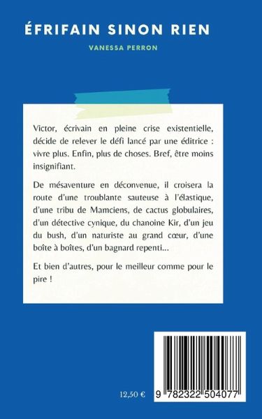 Victor, écrivain en plein crise existentielle, décide de relever le défi lancé par une éditrice : vivre plus. Enfin, plus de choses. Bref, être moins insignifiant.De mésaventure en déconvenue, il croisera la route d'une troublante sauteuse à l'élastique, d'une tribu de Mamciens, de cactus globulaires, d'un détective cynique, du chanoine Kir, d'un jeu du bush, d'un naturiste au grand coeur, d'une boîte à boîtes, d'un bagnard repenti...Et bien d'autres, pour le meilleur comme pour le pire!