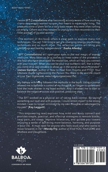 I wrote EFT Constellations after becoming acutely aware of how much my clients desperately wanted to open their hearts to meaningful living. The pressures some of them felt on a daily basis meant they were often running on empty. Others said they needed to unplug and then reconnect to their inner wisdom of joy and wonder. The content of this book offers a clear path to explore many rich techniques. You will find simple yet life-changing energy psychology techniques and so much more. The reflection points will bring you confidence and healthy independence (Sasha Allenby). EFT Constellations will open your eyes to the real magic of energy medicine. Mary takes us on a journey to meet some of the pioneers in this field who have developed the modalities, which will help you connect with your true self. When you can be your true authentic self, that is when you come alive and are able to show up in the world as nature intended (James Gardner, author of How to Heal from Trauma and PTSD: Your Ultimate Guide to Becoming the Person You Want to Be and life coach at Live Your Greatness, www.liveyourgreatness.life). My therapy with Mary followed the methods in the book. Using a journal allowed me to become in control of my thoughts, as I began to understand how the inner chatter in my head worked. And it allowed me to start to balance the negative voices with positive, proactive ones. The EFT worked as a physical act of taking back control. By saying something out loud and with purpose, I could retrain myself to be strong minded. I was no longer victimized by my own thoughts or sabotaged by my past (Kay Leggott). This empowering read explores how mind and body connect and provides simple, practical, and effective strategies to remove blocks, treat pain, aid sleep, improve relaxation, and guides you toward enjoying a sense of achieving more balance, harmony, and purpose in your life. A must read for anyone who feels stuck and who wants to move forwards in life (Wendy Fry, author of Find YOU, Find LOVE and Mothers and Daughters)