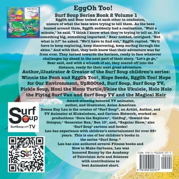 The "Surf Soup" series is a children's book series written and illustrated by Donna Kay Lau, an Emmy honored award-winning TV animator EggOh and Bear looked at each other in confusion, unsure of what the bees were trying to tell them. As the bees buzzed around them, EggOh suddenly had a realization. "Wait a minute," he said. "I think I know what they're trying to tell us. It's something big, something important." Bear nodded, intrigued. "But what is it?" he asked. "We'll have to find out," EggOh replied. "We'll have to keep exploring, keep discovering, keep surfing through the skies." And with that, they both knew that their adventure was far from over. They turned towards the horizon, ready to face whatever challenges lay ahead in the next part of their story. "Let's go go," Bear said, and with a whoosh of air, they soared off into the distance, ready for their next great adventure.Here are a few more morals and lessons that can be found in the Surf Soup books?Learning to overcome fears.The importance of friendship.Appreciating nature.Being creative and imaginative.Pursuing your dreams.Friendship: The series emphasizes the importance of making new friends and working together to overcome challenges.Adventure: Each book takes readers on a new adventure with EggOh and the other characters, encouraging a sense of curiosity and exploration.Courage?Love and kindness: In "EggOh Too! Broadcasting Love," EggOh's mission is to broadcast love throughout Surf Soup. The series emphasizes the importance of love and kindness towards others.Perseverance?Overall, the Surf Soup book series promotes positive values and encourages readers to be curious, creative, kind, and courageous.
