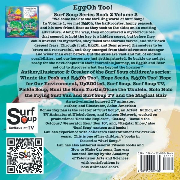 The "Surf Soup" series is a children's book series written and illustrated by Donna Kay Lau, an Emmy honored award-winning TV animator EggOh and Bear looked at each other in confusion, unsure of what the bees were trying to tell them. As the bees buzzed around them, EggOh suddenly had a realization. "Wait a minute," he said. "I think I know what they're trying to tell us. It's something big, something important." Bear nodded, intrigued. "But what is it?" he asked. "We'll have to find out," EggOh replied. "We'll have to keep exploring, keep discovering, keep surfing through the skies." And with that, they both knew that their adventure was far from over. They turned towards the horizon, ready to face whatever challenges lay ahead in the next part of their story. "Let's go go," Bear said, and with a whoosh of air, they soared off into the distance, ready for their next great adventure.Here are a few more morals and lessons that can be found in the Surf Soup books?Learning to overcome fears.The importance of friendship.Appreciating nature.Being creative and imaginative.Pursuing your dreams.Friendship: The series emphasizes the importance of making new friends and working together to overcome challenges.Adventure: Each book takes readers on a new adventure with EggOh and the other characters, encouraging a sense of curiosity and exploration.Courage?Love and kindness: In "EggOh Too! Broadcasting Love," EggOh's mission is to broadcast love throughout Surf Soup. The series emphasizes the importance of love and kindness towards others.Perseverance?Overall, the Surf Soup book series promotes positive values and encourages readers to be curious, creative, kind, and courageous.
