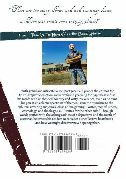 With grand and intricate verse, poet Jace Paul probes the cosmos for truth. Empathic emotion and a profound yearning for happiness infuse his words with unabashed honesty and witty irreverence, even as he aims his pen at an eclectic spectrum of themes. From the mundane to the sublime, covering subjects such as online gaming, Twitter, mental illness, cosmology, and theology, Paul "writes for the other side." Through words crafted with the aching sadness of a depressive and the mirth of a satirist, he invites his readers to consider our collective heartbreak - and how we might discover new hope together.