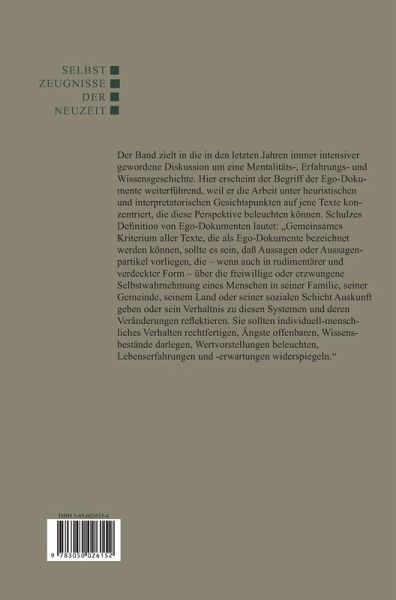 Die Beiträge dieses Bandes versuchen, ein möglichst breites Spektrum möglicher Varianten von Ego-Dokumenten abzudecken. Es sollen darunter alle jene Quellen verstanden werden, in denen ein Mensch Auskunft über sich selbst gibt, unabhängig davon, ob dies freiwillig - also etwa in einem persönlichen Brief, einem Tagebuch, einer Traumniederschrift oder einem autobiographischen Versuch - oder durch anere Umstände bedingt, geschieht.