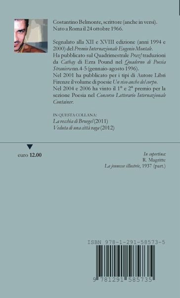 Costantino Belmonte, scrittore (anche in versi). Nato a Roma il 24 ottobre 1966. Nel novembre 2004 è uno dei poeti partecipanti al Progetto Klandestini - Letteratura emergente del Mediterraneo, col sostegno del British Council e di Inizjamed di Malta. Il 18 novembre 2005 ha curato come autore e regista la lettura *Un corpo capace di felicità* al Rialtosantambrogio per UbuSettete! - Fiera di alterità teatrali romane, IV edizione. Redattore per la sezione *letteratura* della webzine trimestrale Amnesia Vivace (ora offline). Segnalato alla XII e XVIII edizione (anni 1994 e 2000) del *Premio Internazionale Eugenio Montale*. Ha pubblicato sul Quadrimestrale *Praz!* traduzioni da *Cathay* di Ezra Pound nel *Quaderno di Poesia Straniera* nn. 4-5 (gennaio-agosto 1996). Nel 2001 ha pubblicato per i tipi di Autore Libri Firenze il volume di poesie *Un viso anche del corpo*. Nel 2004 e 2006 ha vinto il 1° e 2° premio per la sezione poesia nel *Concorso Letterario Internazionale Container*. Nel giugno 2014 è vincitore del *Premio dei Premi di Poesia* indetto e organizzato dalla libreria *Mangiaparole* di Roma (EPC, *Edizioni Progetto Cultura*) Con il volume di versi *Su un pianeta* è vincitore del 5° Contest *ilmioesordio 2015* per la Poesia, indetto dal Gruppo Editoriale L'Espresso. *Su un pianeta* è stato pubblicato nel 2017 per i tipi di E.P.C. - Edizioni Progetto Cultura, a Roma. Nel 2018 ha pubblicato il volume di versi *Gli alberi, per esempio* per le Edizioni La Gru. Traduzioni in inglese di alcuni suoi brani sono apparse sul portale Parallel Texts, a cura di Matilda Colarossi.