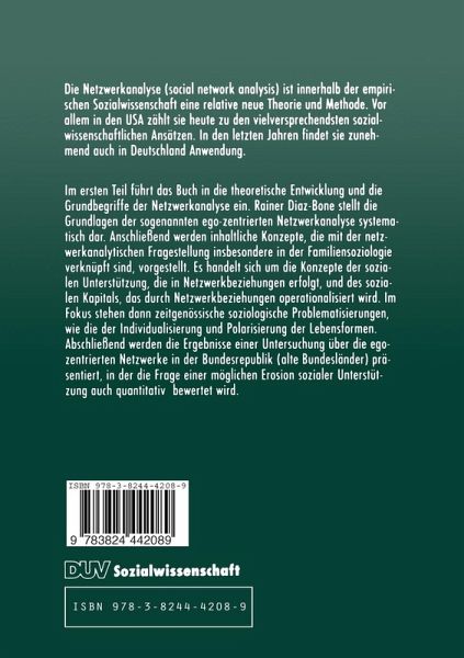 Die Netzwerkanalyse (social network analysis) ist innerhalb der empirischen Sozialwissenschaft eine relative neue Theorie und Methode. Vor allem in den USA zählt sie heute zu den vielversprechendsten sozialwissenschaftlichen Ansätzen. In den letzten Jahren findet sie zunehmend auch in Deutschland Anwendung. Im ersten Teil führt das Buch in die theoretische Entwicklung und die Grundbegriffe der Netzwerkanalyse ein. Rainer Diaz-Bone stellt die Grundlagen der sogenannten ego zentrierten Netzwerkanalyse systematisch dar. Anschließend werden inhaltliche Konzepte, die mit der netzwerkanalytischen Fragestellung insbesondere in der Familiensoziologie verknüpft sind, vorgestellt. Es handelt sich um die Konzepte der sozialen Unterstützung, die in Netzwerkbeziehungen erfolgt, und des sozialen Kapitals, das durch Netzwerkbeziehungen operationalisiert wird. Im Fokus stehen dann zeitgenössische soziologische Problematisierungen, wie die der Individualisierung und Polarisierung der Lebensformen. Abschließend werden die Ergebnisse einer Untersuchung über die ego-zentrierten Netzwerke in der Bundesrepublik (alte Bundesländer) präsentiert, in der die Frage einer möglichen Erosion sozialer Unterstützung auch quantitativ bewertet wird.