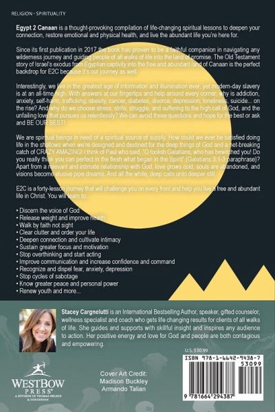 Egypt 2 Canaan is a thought-provoking compilation of life-changing spiritual lessons to deepen your connection, restore emotional and physical health, and live the abundant life you're here for. Since its first publication in 2017 the book has proven to be a faithful companion in navigating any wilderness journey and guiding you into the promised land flowing with milk and honey. The Old Testament story of Israel's exodus from Egyptian captivity into the free and abundant land of Canaan is the perfect backdrop for E2C because it's our journey as well. Interestingly, we live in the greatest age of information and illumination ever, yet modern-day slavery is at an all-time high. With answers at our fingertips and help around every corner, why is addiction, anxiety, disconnect, self-harm, trafficking, obesity, divorce, depression, cancer, diabetes, suicide... on the rise? And why are we bent to choose stress, strife, struggle, and suffering to the high call of God and unfailing love that pursues us relentlessly? We can avoid these questions and hope for the best or ask and BE OUR BEST! Quality questions create quality lives. The truth is, we are spiritual beings in need of a spiritual source of supply. I think of Paul who said in effect, "O foolish one, who has bewitched you to not obey the truth... Do you really think you can perfect in the flesh what began in the Spirit" (Galatians 3:1-3 paraphrase)? We will never be satisfied doing life in the shallows when designed and destined for the deep things of God and a net-breaking catch of CRAZY AMAZING! Apart from intimacy and divine revelation love grows cold, discipleship fades, souls are abandoned, and God-given visions become elusive pipe dreams. And deep calls unto deeper still! E2C is a forty-lesson journey that will challenge you on every front and help you live a free and abundant life in Christ. You will learn to... ¿ Discern the voice of God ¿ Release weight and improve health ¿ Walk by faith not sight ¿ Clear clutter and order your life ¿ Deepen connection and cultivate intimacy ¿ Sustain greater focus and motivation ¿ Stop overthinking and start acting ¿ Improve communication and increase confidence and command ¿ Recognize and dispel fear, anxiety, depression ¿ Stop cycles of sabotage ¿ Know greater peace and personal power ¿ Renew youth and more...