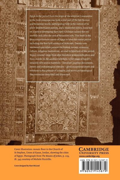 Egypt in the period from the reign of the emperor Constantine to the Arab conquest was both a vital part of the Late Roman and Byzantine world, participating fully in the culture of its wider Mediterranean society, and a distinctive milieu, launched on a path to developing the Coptic Christian culture that we see fully only after the end of Byzantine rule. This book is the first comprehensive survey of Egypt to treat this entire period including the first half-century of Arab rule. Twenty-one renowned specialists present the history, society, economy, culture, religious institutions, art and architecture of the period. Topics covered range from elite literature to mummification and from monks to Alexandrian scholars. A full range of Egypt's uniquely rich source materials - literature, papyrus documents, letters, and archaeological remains - gives exceptional depth and vividness to this portrait of a society, and recent archaeological discoveries are described and illustrated.