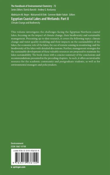 Environmental and Climatic Implications of Lake Manzala, Egypt: Modeling and Assessment.- Modeling of Water Quality Parameters in Manzala Lake Using Adaptive Neuro-Fuzzy Inference System and stochastic models.- Investigating the Impacts of Dredging on Improving The Water Quality and Circulation of Lake Mariout Via Hydrodynamics.- Environmental Impacts on Egyptian Delta Lakes Biodiversity: A Case Study on Lake Burullus.- Coastal Lakes as Hot Spots for Plant Diversity in Egypt.- Responses of Zooplankton to Long-Term Environmental Changes in the Egyptian Coastal Lakes.- Fisheries of Egyptian Delta Coastal Wetlands; Burullus Wetland Case Study.- Earth Observations for Egyptian coastal lakes monitoring and management.- Are the Egyptian Coastal Lakes Sustainable? A Comprehensive Review Based on Remote Sensing Approach.- Changes in Coastal Lake Dynamic System and potential Restoration.- Summary, Conclusions, and Recommendations for Egyptian Coastal Lakes and Wetlands: Climate Changeand Biodiversity.- Erratum to: Earth Observations for Egyptian Coastal Lakes Monitoring and Management.