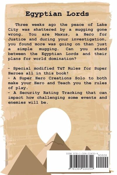 Buy this Solo and become a Super Hero! Three weeks ago the peace of Lake City was shattered by a mugging gone wrong. You are Maxus, a Hero for Justice and during your investigation, you found more was going on than just a simple mugging. Can you stand between the Egyptian Lords and their plans for world domination? - Special modified T&T Rules for Super Heroes all in this book! - A Super Hero Creations Solo to both make your Hero and Teach you the rules of play. - A Security Rating Tracking that can impact how challenging some events and enemies will be.