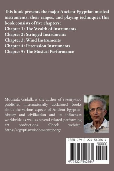 This book consists of five chapters: Chapter 1: The Wealth of Instruments will cover the general characteristics of Egyptian instruments as well the major components of the musical orchestra Chapter 2: Stringed Instruments will cover various Ancient Egyptian stringed instruments such as lyres, tri-gonon (zither), Harps including playing techniques: Harps-Playing Techniques; The All-Encompassing Capacities of Ancient; string instruments with neck-such as short-neck Lute; the long-neck Egyptian guitars; and Bowed Instruments [Kamanga, Rababa]. Chapter 3: Wind Instruments will cover The end blown flute; transverse flute; pan flute; single reed pipe (clarinet); double Pipe; double clarinet; double oboe; arghool; others (bagpipe and organ); and horns/trumpets. Chapter 4: Percussion Instruments will cover the membrano-phone instruments such as drums and tambourines; and the non-membrano-phone (idiophone) instruments such as percussion sticks, clappers, sistrums/sistra, cymbals, castanets, bells (chimes), xylophone and glockenspiel and human parts (hands, fingers, thighs, feet, etc.). Chapter 5: The Musical Performance will cover the significance and roles of the fingers and their knuckles in producing and directing musical performances; as well as the varied methods for maintaining the rhythmic timing/tempo-including the use of syllables.
