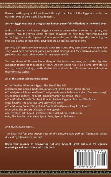 Drama, death, glory and love flowed through the blood of the Egyptians under the watchful eyes of their Gods & Goddesses... Ancient Egypt was one of the greatest & most powerful civilizations in the world ever And of all ancient civilizations, Egyptians rule supreme when it comes to mystery and fantasy...From the lavish colors of their papyruses to how they mastered building technology thousands of years before anyone else, and to the legends surrounding the lives and deaths of their kings. Egyptians are an eternal source of awe. Not only did they know how to build great structures, they also knew how to have fun. They loved beer and board games, they used makeup, and they allowed women more freedom than many other women in the ancient world. You see, Game of Thrones has nothing on the intricacies, wars, and battles Egyptian dynasties fought for thousands of years. Ancient Egypt has it all: drama, love stories, myths, massive buildings, death, destruction and pain. Let's listen to them and explore their timeless stories! All of this and much more including: The Timeline Of Ancient Egypt: The Rise & The Fall Discover The Gods & Goddesses of Ancient Egypt + Their Classic Stories The Mystery & Miracle of How The Pyramids Were Built (was it aliens? or astronomy?) Cleopatra's Legacy: The Most Famous Pharaoh & Femme Fatale The Afterlife, Burials, Tombs & How An Ancient Egyptian Mummy Was Made Isis & Osiris: The Greatest Love Story of All Time The Mummy Curse - What Killed People Who Opened King Tut's Tomb? Decoding The Secrets Of Egyptian Hieroglyphs Interesting Facts About Egyptian Culture: Art, Music, & Literature Ra, The Sun God of Ancient Egypt: Facts, Symbol & Powers And much, much more... This book will fuel your appetite for all the amazing (and perhaps frightening) things Ancient Egyptians were and did. Begin your journey of discovering not only Ancient Egypt but also it's legends, mythology and much more with this book.