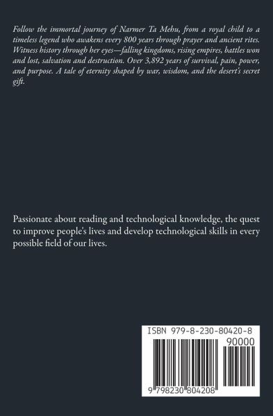 Follow the immortal journey of Narmer Ta Mehu, from a royal child to a timeless legend who awakens every 800 years through prayer and ancient rites. Witness history through her eyes-falling kingdoms, rising empires, battles won and lost, salvation and destruction. Over 3,892 years of survival, pain, power, and purpose. A tale of eternity shaped by war, wisdom, and the desert's secret gift.