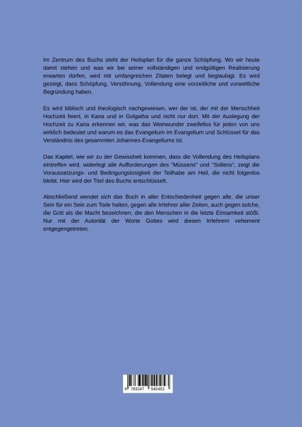 Im Zentrum des Buchs steht der Heilsplan für die ganze Schöpfung. Wo wir heute damit stehen und was wir bei seiner vollständigen und endgültigen Realisierung erwarten dürfen, wird mit umfangreichen Zitaten belegt und beglaubigt. Es wird gezeigt, dass Schöpfung, Versöhnung, Vollendung eine vorzeitliche und vorweltliche Begründung haben.Es wird biblisch und theologisch nachgewiesen, wer der ist, der mit der Menschheit Hochzeit feiert, in Kana und in Golgatha und nicht nur dort. Mit der Auslegung der Hochzeit zu Kana erkennen wir, was das Weinwunder zweifellos für jeden von uns wirklich bedeutet, und warum es das Evangelium im Evangelium und der Schlüssel für das Verständnis des gesamten Johannes-Evangeliums ist.Das Kapitel, wie wir zu der Gewissheit kommen, dass die Vollendung des Heilsplans eintreffen wird, widerlegt alle Aufforderungen des "Müssen" und "Sollens", zeigt die Voraussetzungs- und Bedingungslosigkeit der Teilhabe am Heil, die nicht folgenlos bleibt. Hier wird der Titel des Buchs entschlüsselt.Abschließend wendet sich das Buch in aller Entschiedenheit gegen alle, die unser Sein für ein Sein zum Tode halten, gegen alle Irrlehrer aller Zeiten, auch gegen solche, die Gott als die Macht bezeichnen, die den Menschen in die letzte Einsamkeit stößt. Nur mit der Autorität der Worte Gottes wird diesen Irrlehren vehement entgegengetreten.